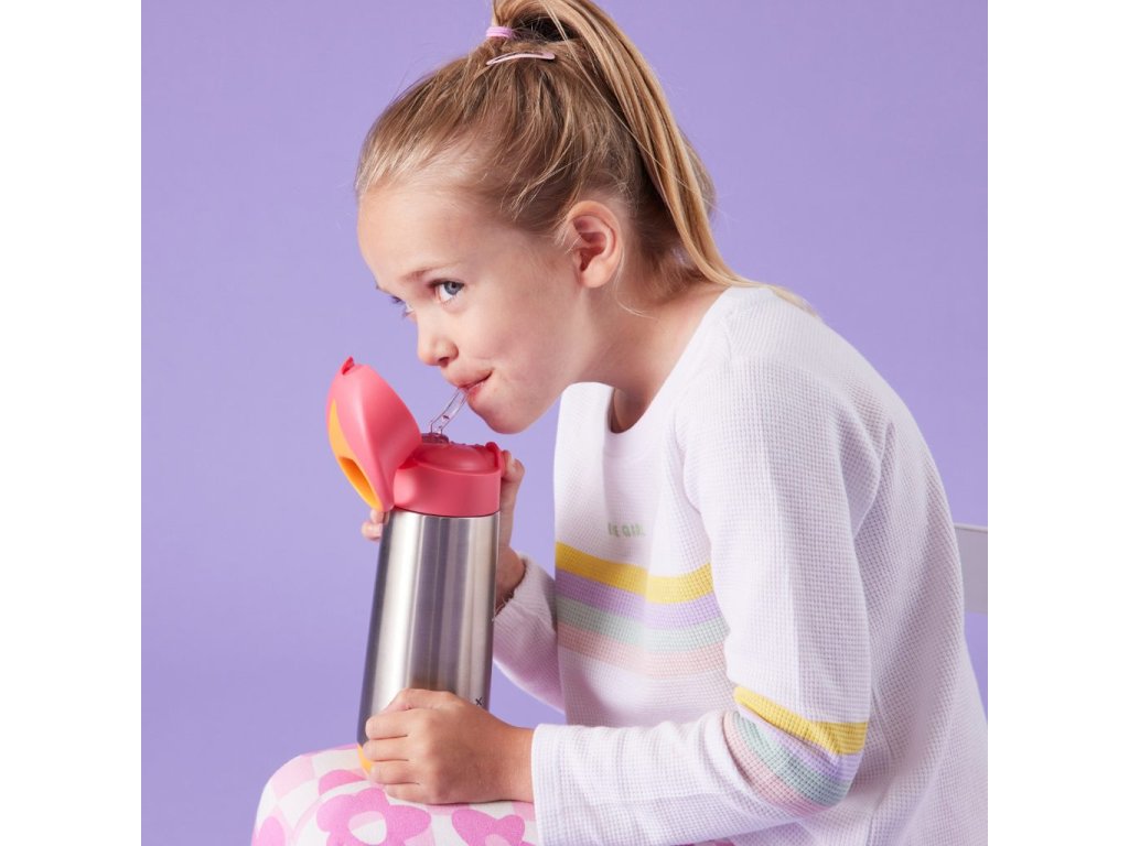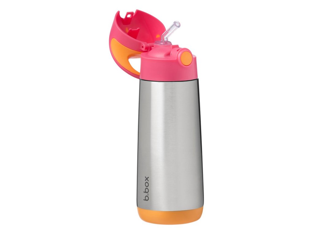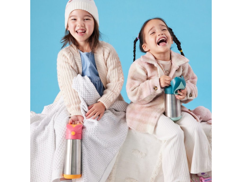 Dvouplášťová termoska z nerezové oceli udrží tekutiny studené až 15 hodin a teplé až 8 hodin. Silikonové brčko dovolí vypít z termosky i tu poslední kapku a víčko má držátko pro snadné nošení nebo zavěšení na batoh, kočárek apod. Termoska se po snadném zmáčknutí "tlačítka" lehce otevře.