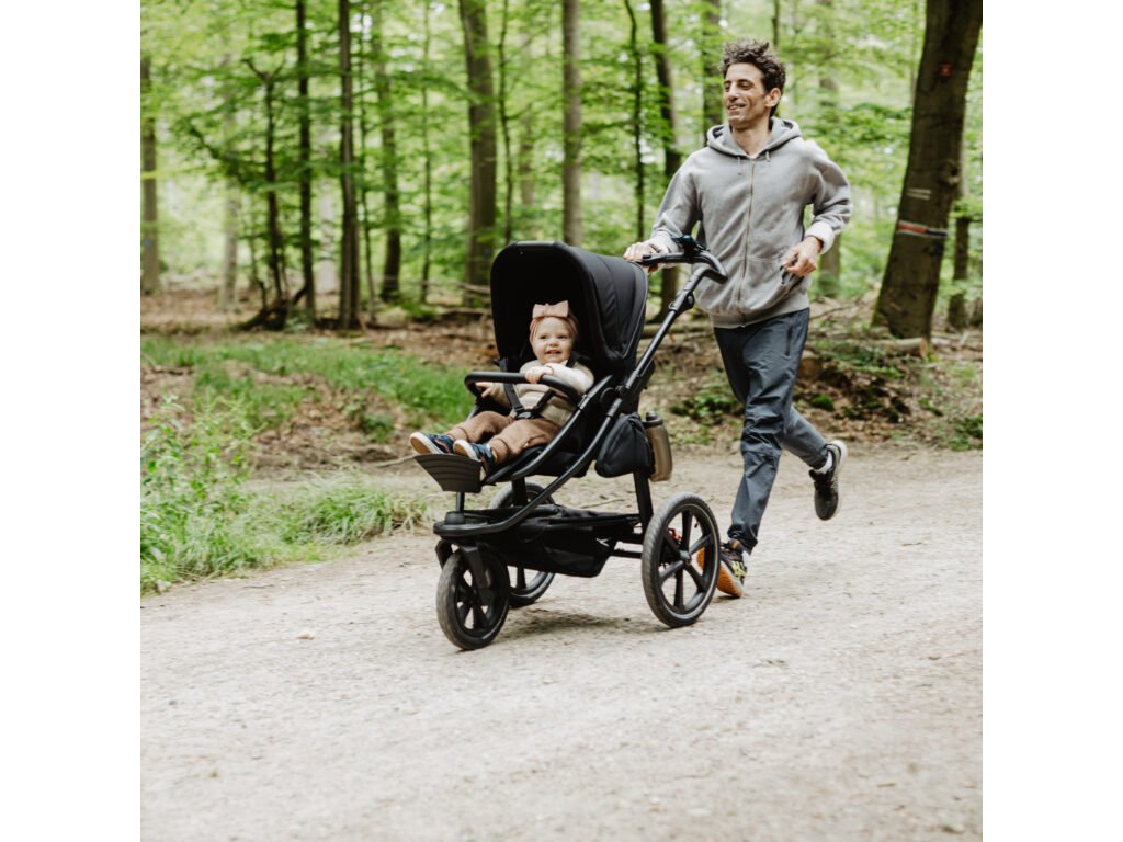 ! Pokiaľ je na konštrukcii kočíka nasadená autosedačka je zakázané s kočíkom behať!