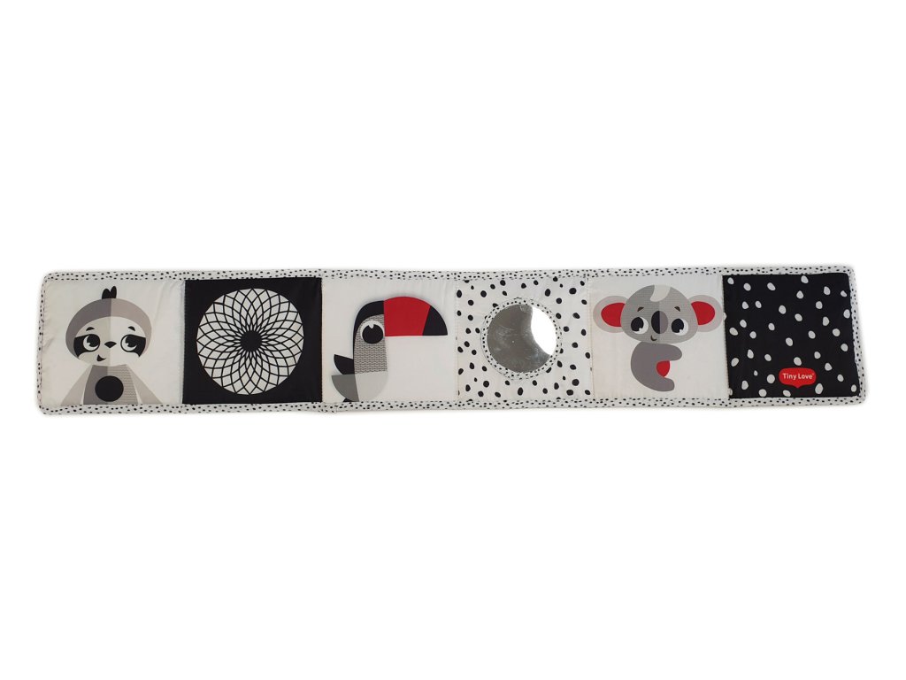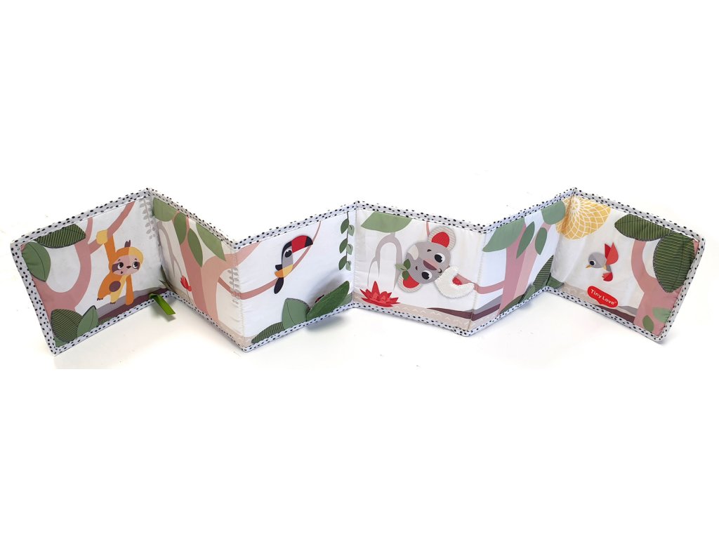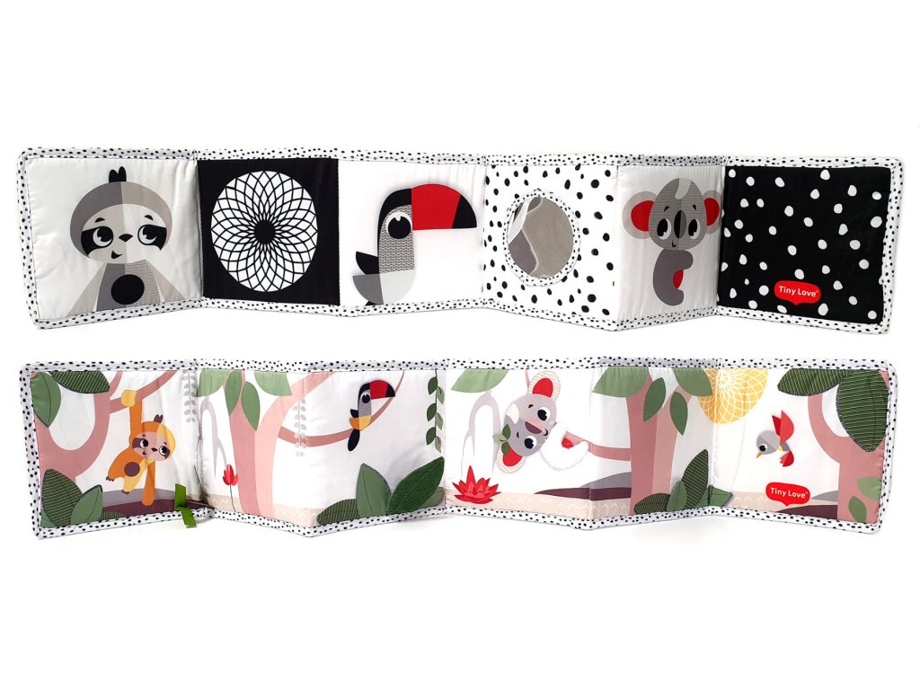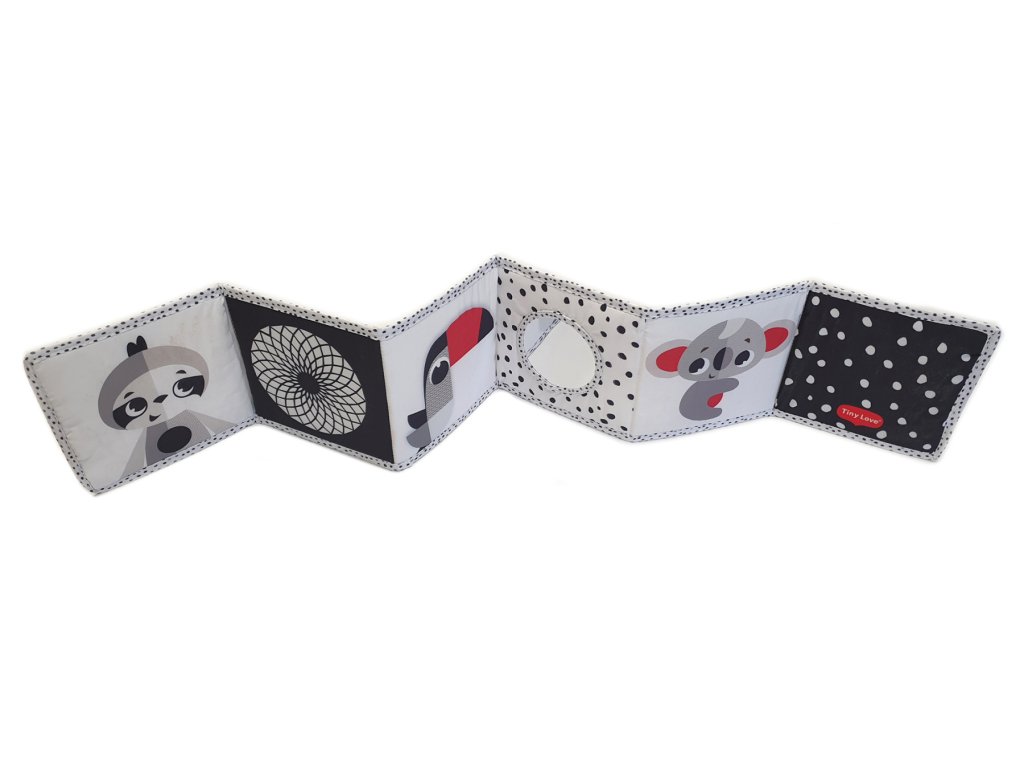 Obsahuje rôzne aktivačné prvky ako zrkadlo, kontrastné ilustrácie, hra na nahliadnutie do hry, šuštiaci list, saténové stuhy a plyšovú nášivku.