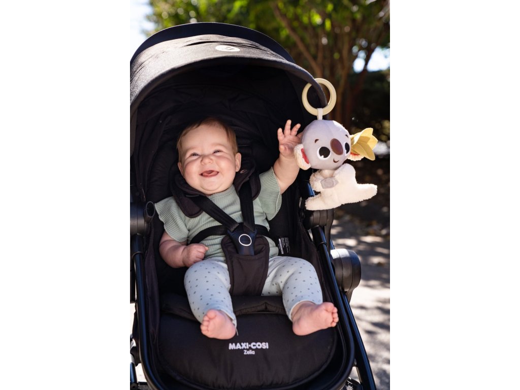 Krúžok na pripevnenie umožňuje jednoduché upevnenie na autosedačku, kočík alebo postieľku, vďaka čomu môže byť Koala Janis stále s vaším dieťatkom.