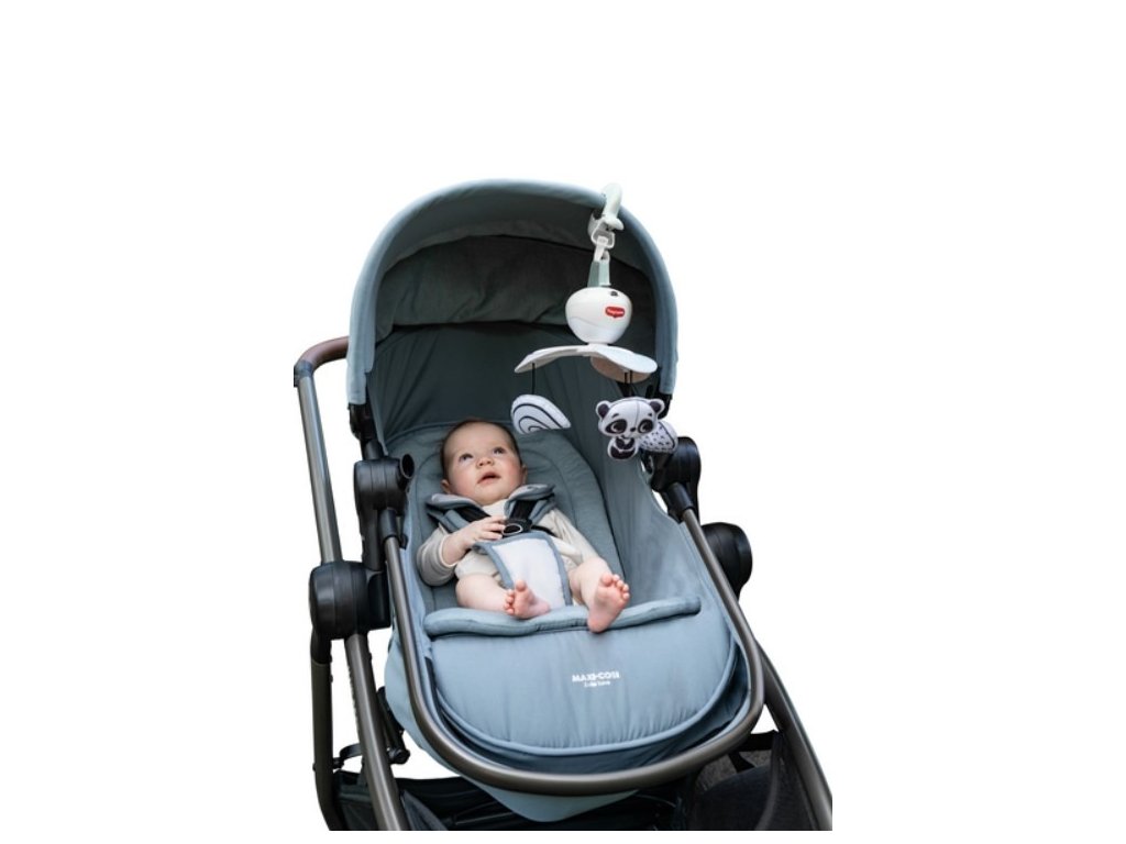 Ľahký pohyb kolotoča, kontrastný čierno-biely dizajn a mäkký zvonček podporujú zrakový a sluchový vývoj.