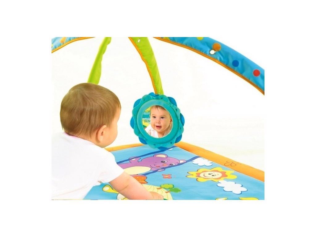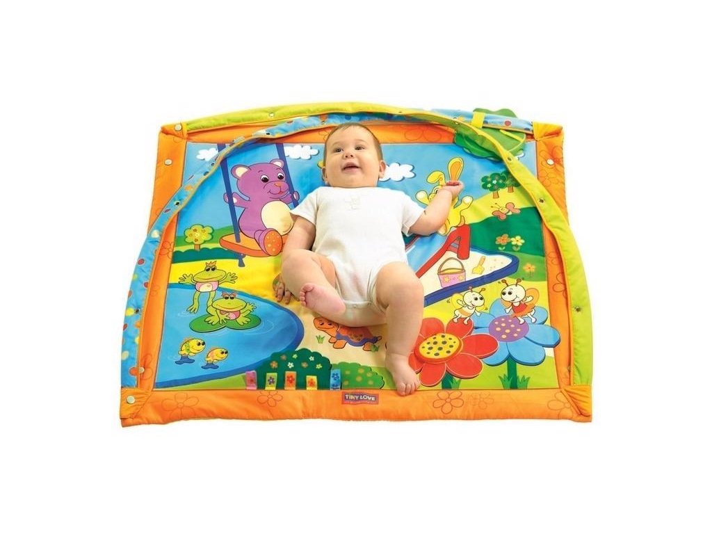 Krásne farebná deka TINY LOVE s veselými obrázkami a skrytými aktívnymi prvkami. Na deku sa inštalujú dve hrazdy, na ktorých sú zavesené hračky. Deka rozvíja všetky zmysly dieťaťa zábavnou formou. Rozmer: 84 × 75 cm.
