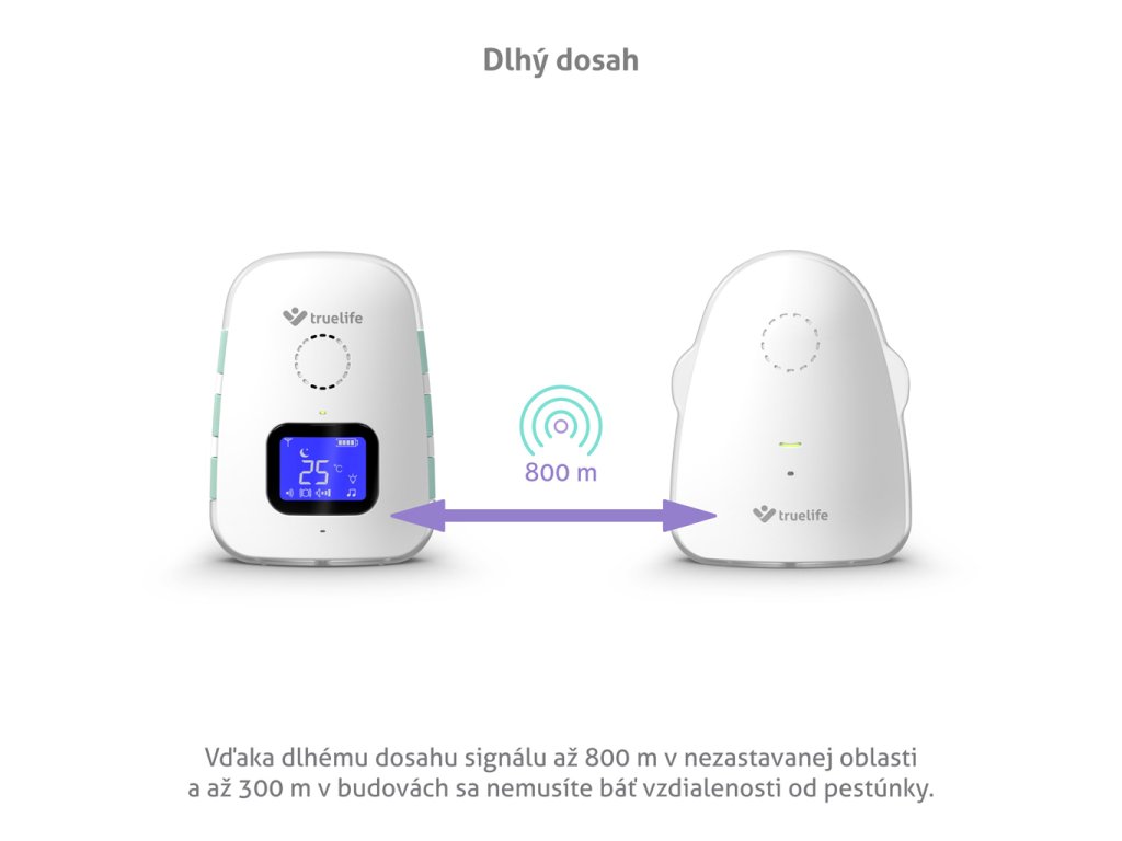 Majte svojich najmenších pod dohľadom, aj keď s nimi práve nie ste v miestnosti. Digitálna audio pestúnka TrueLife NannyTone VM3 zachytí každý zvuk a prenesie ho do rodičovskej jednotky až na vzdialenosť 800 m v nezastavanej oblasti a až 300 m v budove. Než ku dieťaťu prídete, môžete ho utešovať cez pestúnku vďaka možnosti obojsmernej komunikácie. Vybrať je možné aj z 8 integrovaných uspávaniek. Poteší tiež tichým režimom s vibráciami. Integrované batérie v oboch jednotkách majú naozaj dlhú výdrž, pokiaľ by však dochádzali, pestúnka vás včas upozorní. Obdobne sa ihneď dozviete, ak príde ku strate signálu alebo detektor zaznamená nízku či vysokú teplotu v izbe dieťatka.