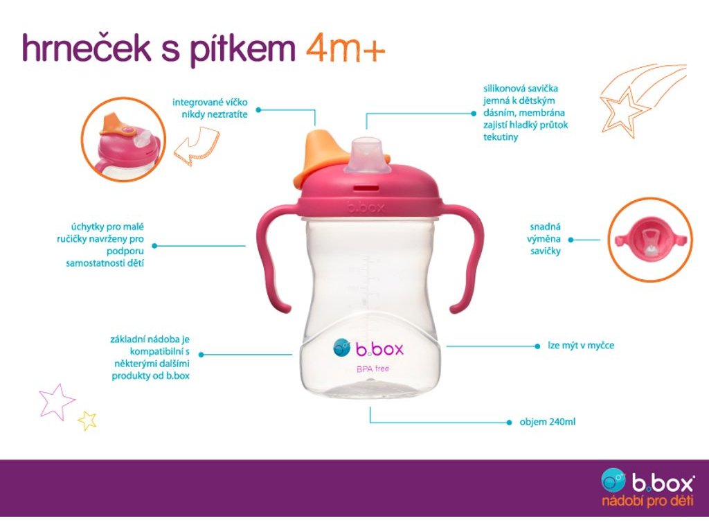 Oblíbená australská značka b.box nabízí skvělou startovací sadu na pití pro nejmenší děti. Sada na pití obsahuje 4 různé hrnečky v 1 a provede vaše miminko od kojenecké láhve až do batolecího věku. Jednoduše vyměňte víčko na hrnečku a můžete zkoušet, co dítěti nejvíce vyhovuje!