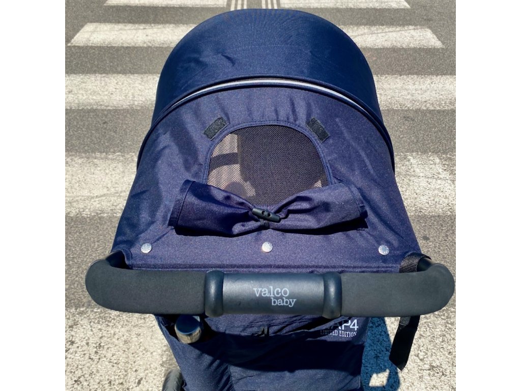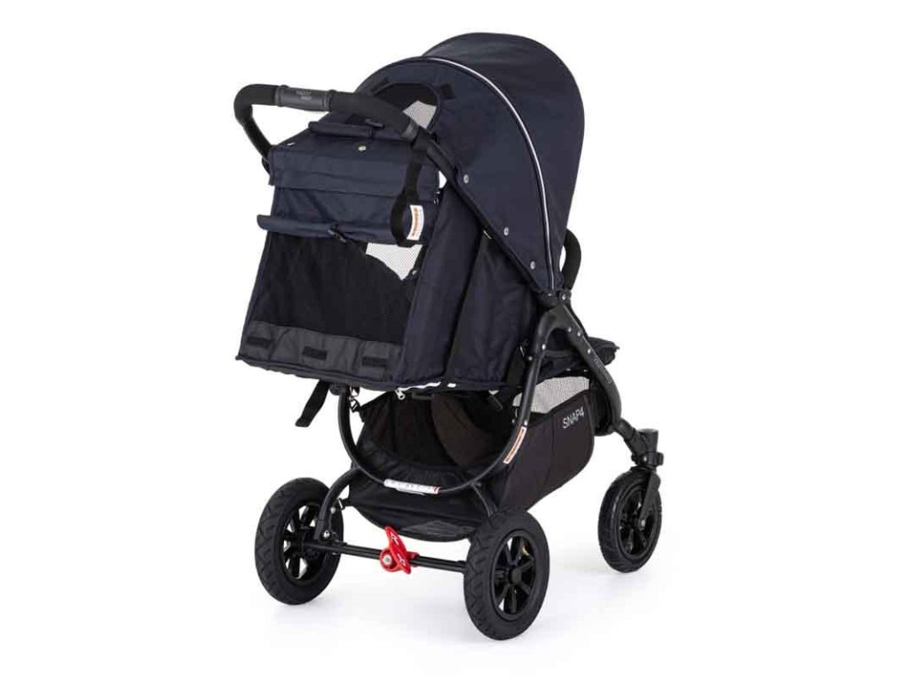 - na zadnej časti opierky sú umiestnené dve vrecká, ktoré je možné zrolovať, čím sa odkryje sieťové okienko cez ktoré cirkuluje vzduch v kočíku