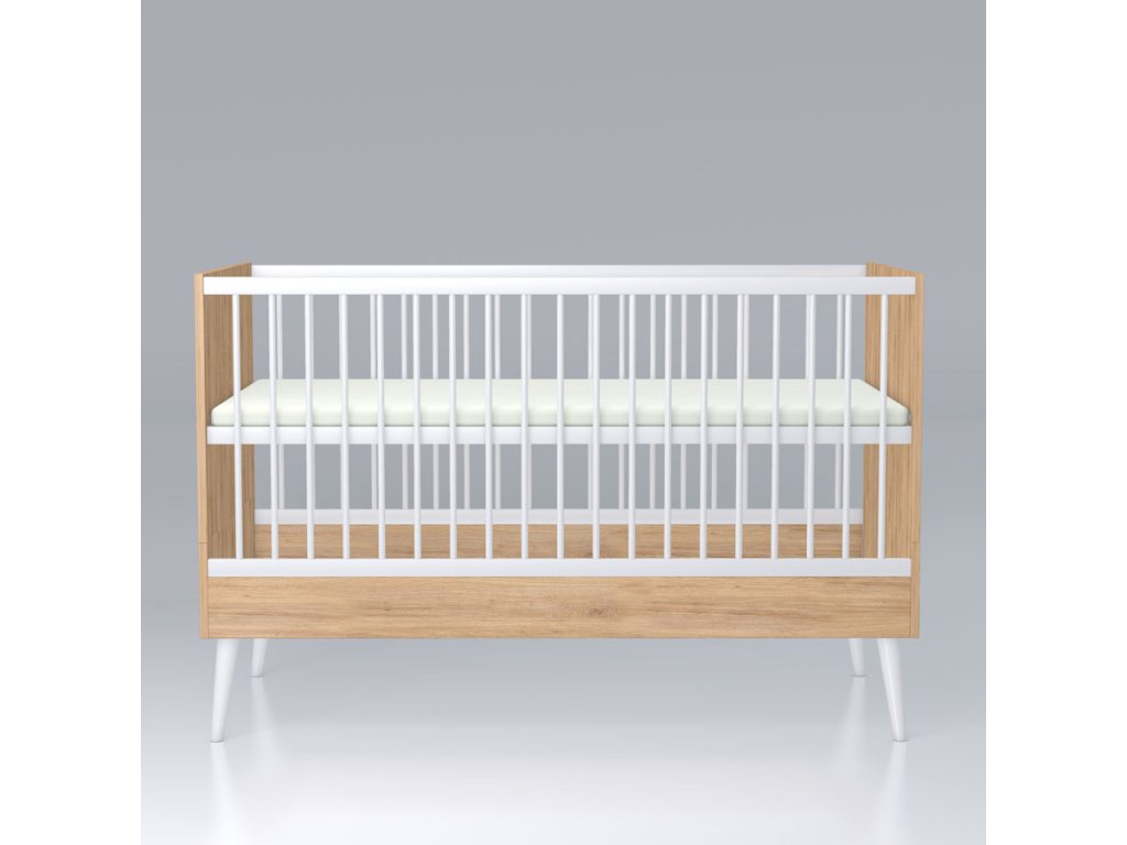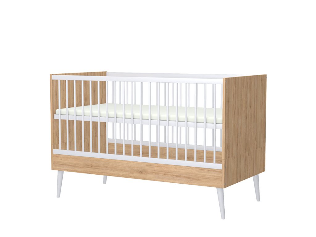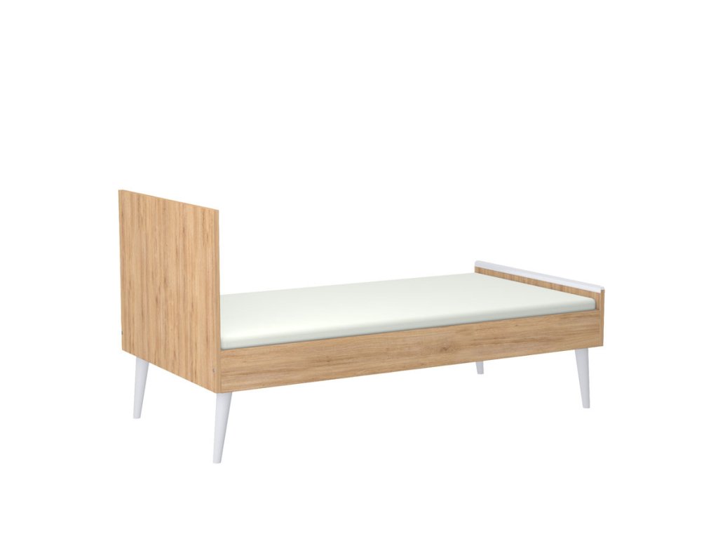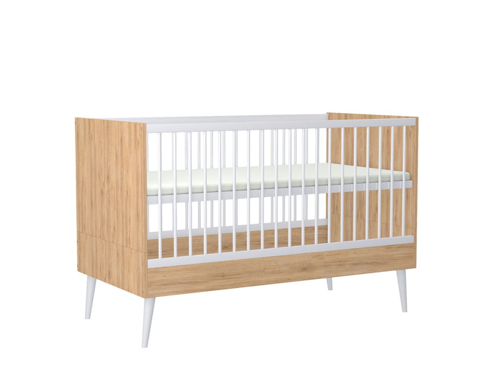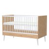 Moderná detská postieľka vyrobená z laminovanej drevotriesky so štruktúrovaným dezénom španielskeho duba a s bielymi bočnicami rovnako ako s roštom z masívu. Je prestaviteľná na posteľ junior alebo pohovku.