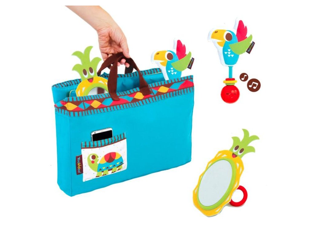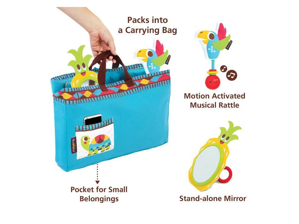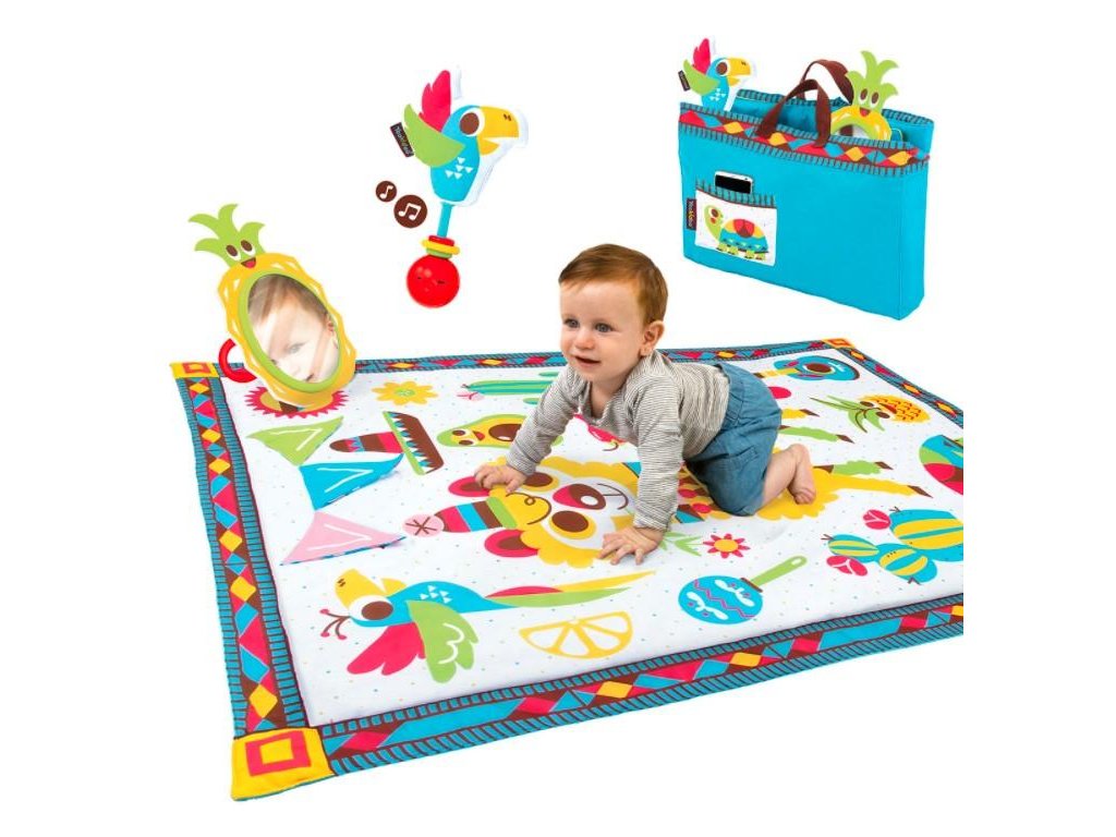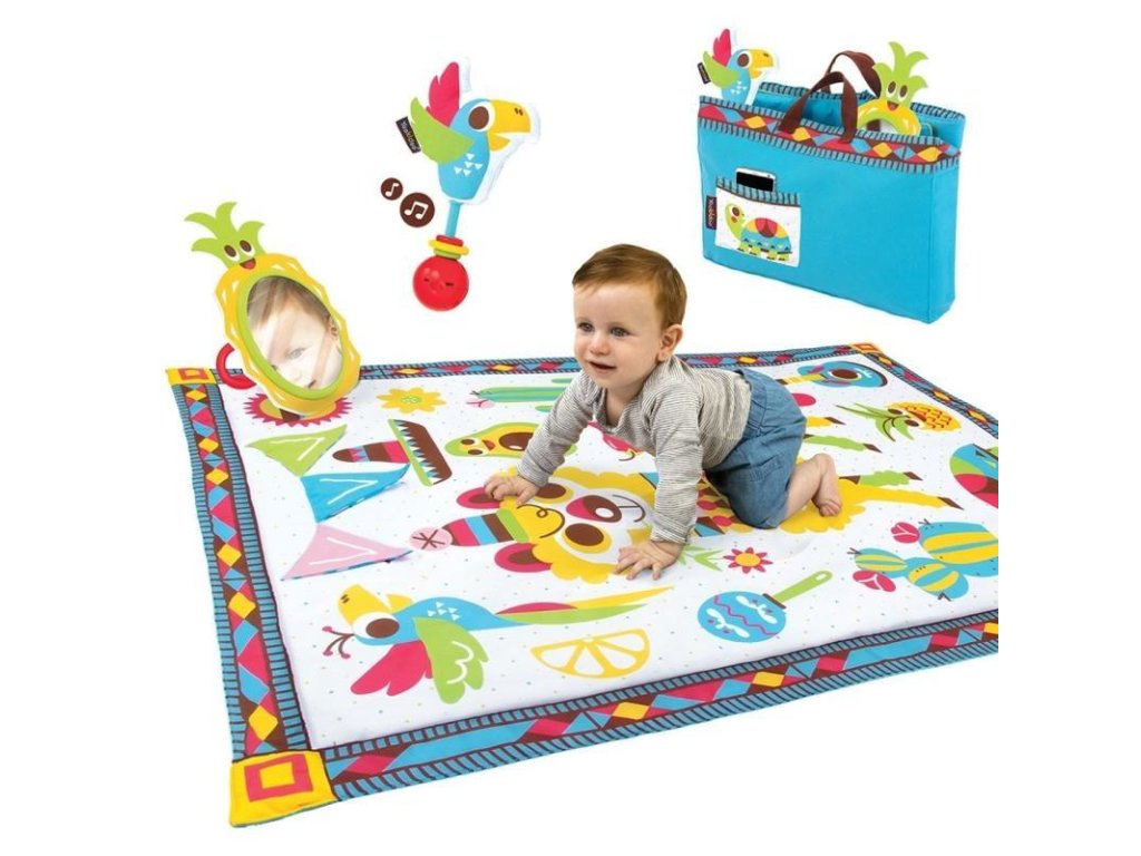 Obsah balenia: skladacie hracia deka, veľké zrkadlo s hrkálkou a hryzátkom, zvukové hrkálka papagáj.